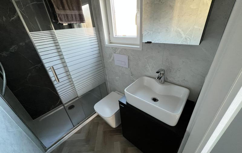 łazienka: przestronna kabina prysznicowa, umywalka oraz zabudowana toaleta.
